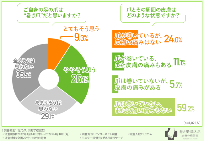 1,025人中502人が足の爪について悩んでおり、さらに502人中約190人が爪が巻いている(巻き爪)ことについて悩んでいることが判明しました。