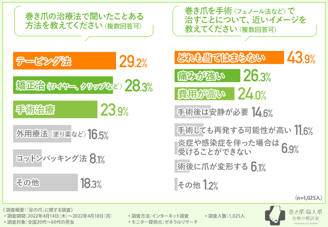 そこで、「巻き爪の治療法で聞いたことある方法を教えてください(複数回答可)」と質問したところ、『テーピング法(29.2%)』と回答した方が最も多く、次いで『矯正治療(ワイヤー、クリップなど)(28.3%)』『手術治療(23.9%)』と続きました。