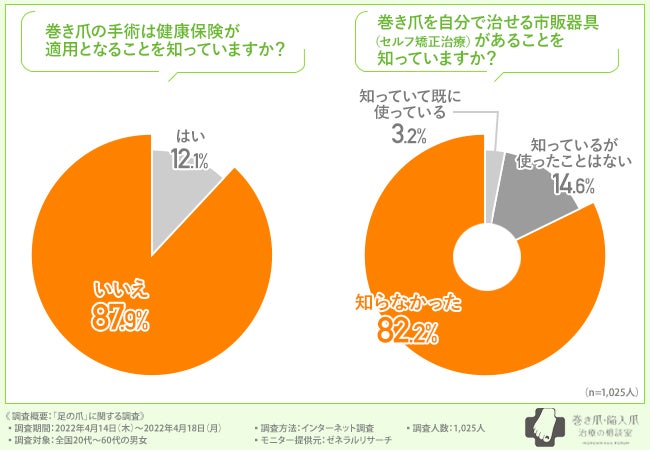 そこで、費用面の不安に関して、「巻き爪の手術は健康保険が適用となることを知っていますか?」と質問したところ、9割近くの方が『いいえ(87.9%)』と回答しました。