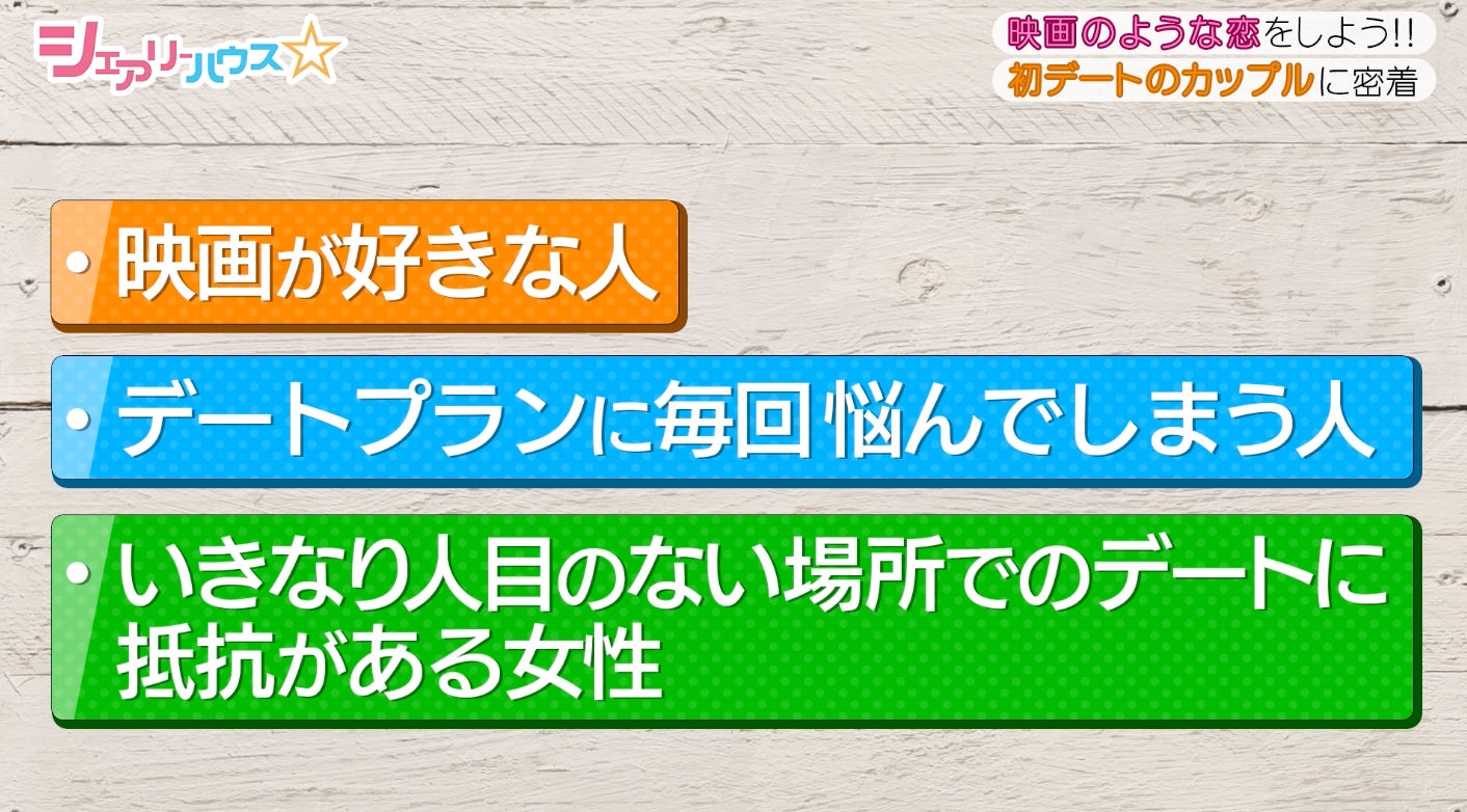 「映画のような恋をしよう!!」〜初デートのカップルに密着〜と題し、Miyouでマッチングした男女2人の映画館デートに密着するという内容になっています。