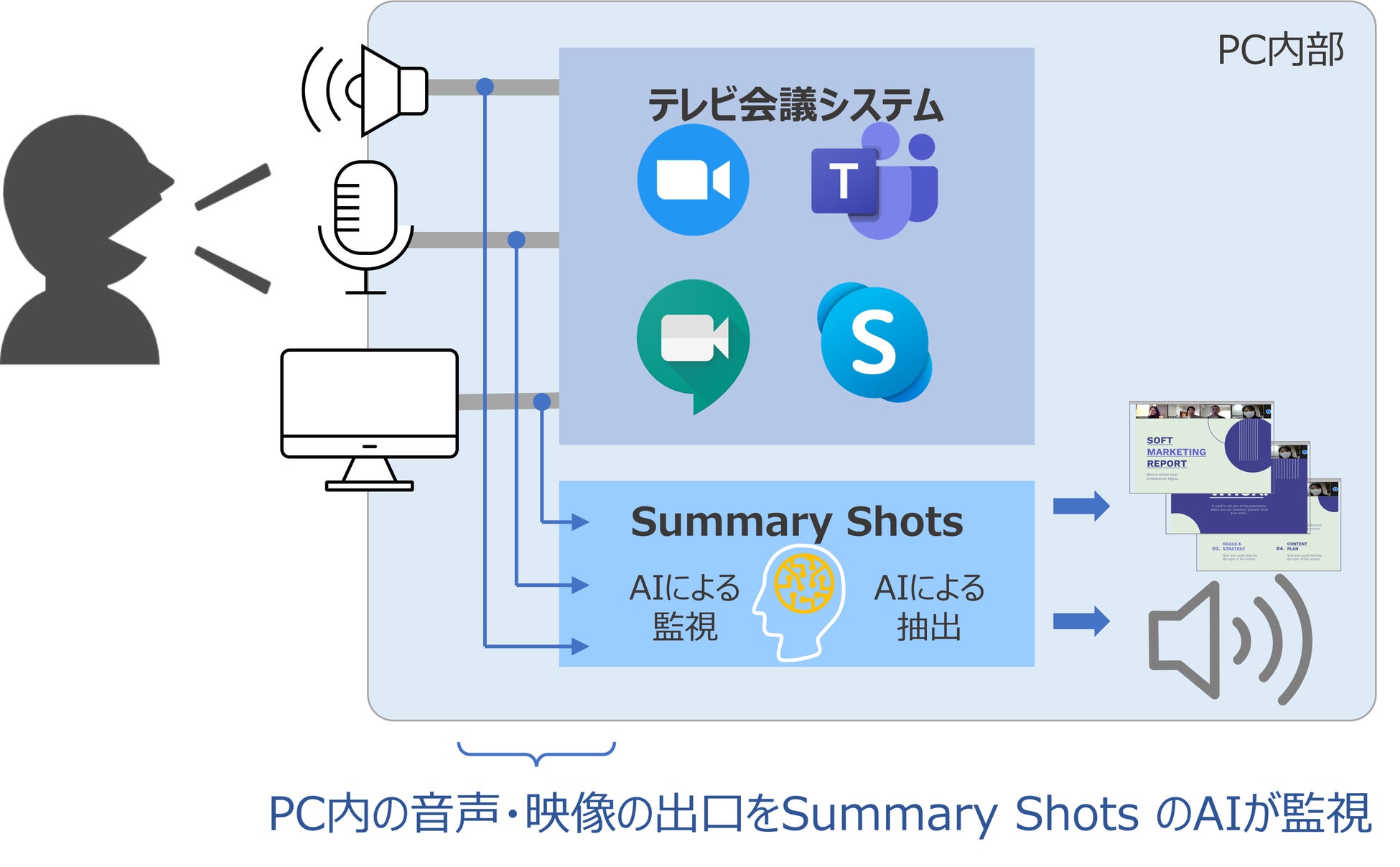 Summary Shots は ZOOM やTeamsなどによるオンライン会議・授業やウェビナーを、AIを用いることで極小容量で録画することができるソフトウェアです。
