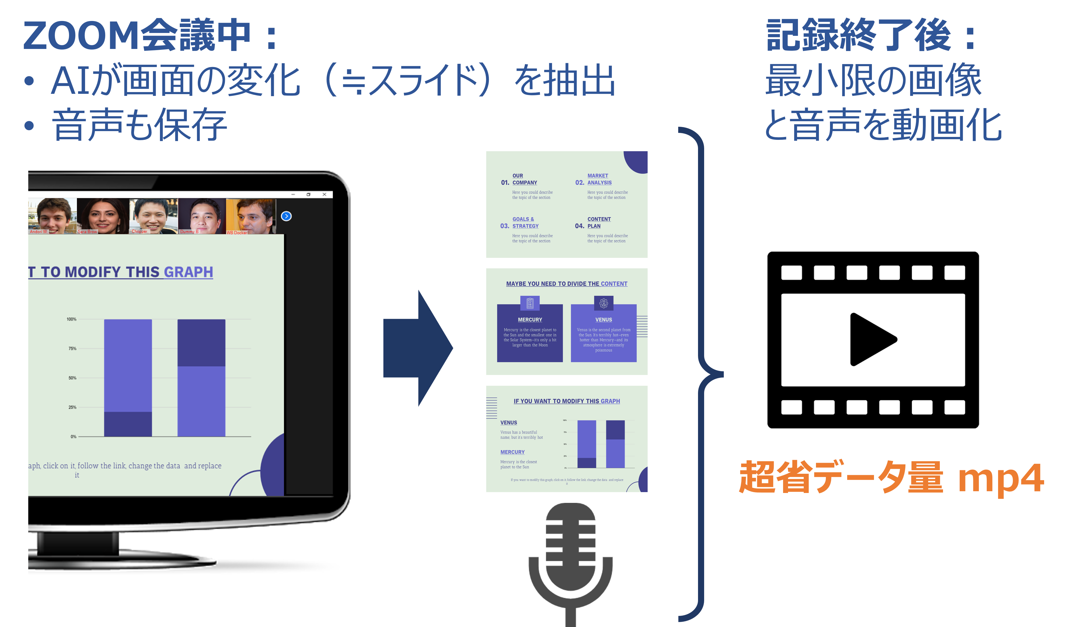 Summary Shots の録画方法は、他の録画方法とは全く異なる画期的なものです。Summary Shots はオンライン会議やオンライン授業の録画に特化しています。会議中はSummary Shots 独自のAIが画面を監視し、表示されているスライドが切り替わった時だけスクショ画像として保存します。会議終了後に保存した画像と音声を組み合わせてMP4の動画ファイルとして構成するため圧倒的に小さいデータ量になるわけです。