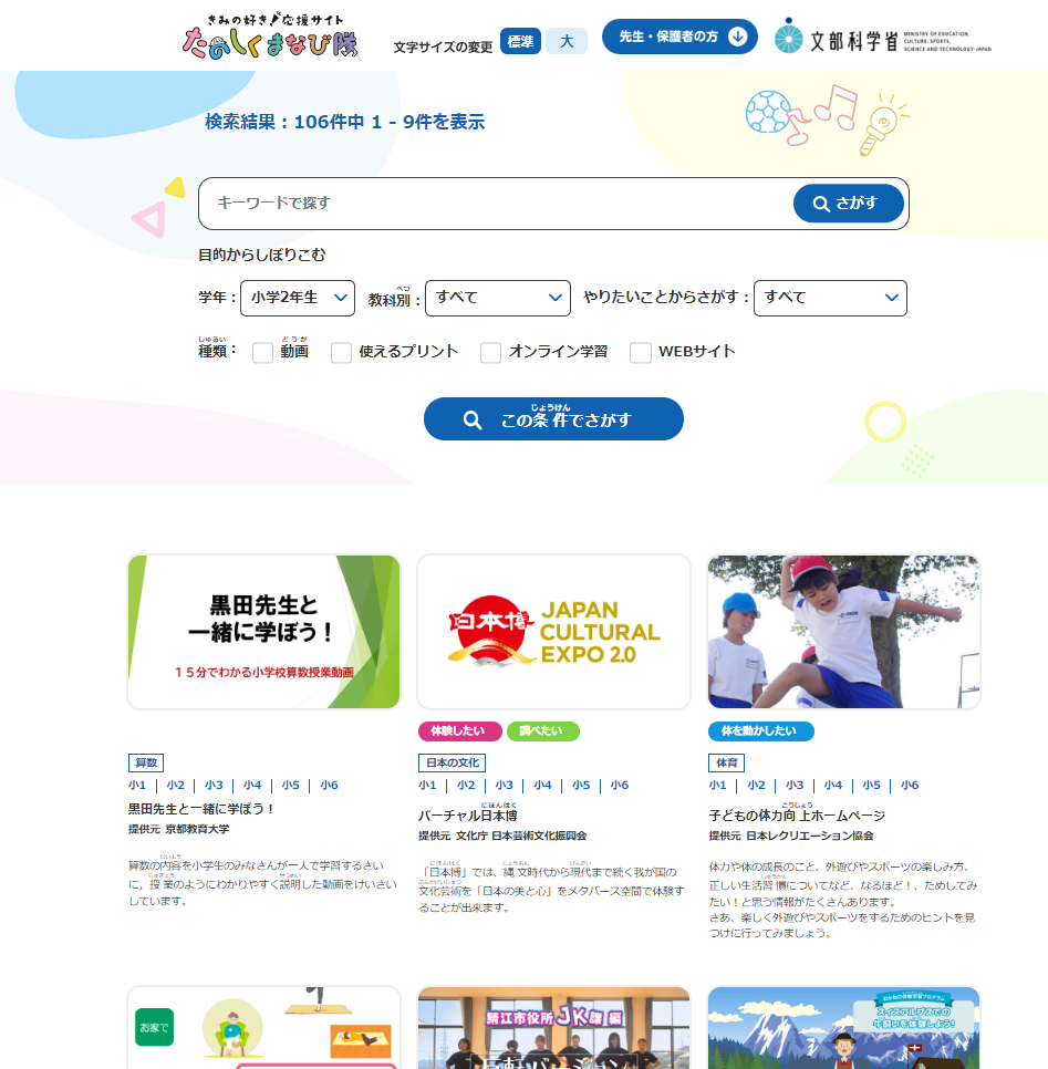 「キーワード検索」「目的」「学年」「教科別」など、様々な角度から検索することができるため、よりご自身の興味関心に合ったコンテンツの検索が可能です。
