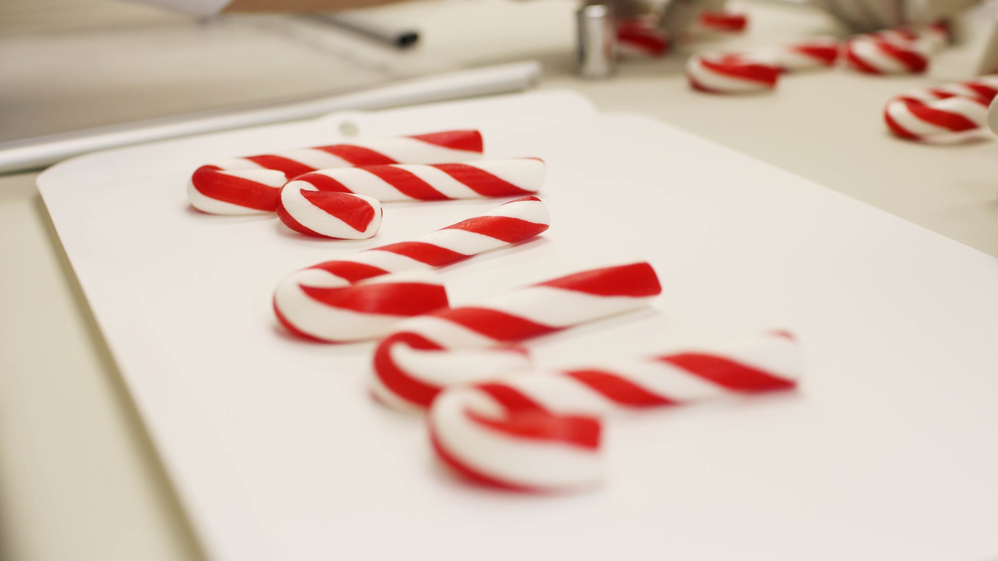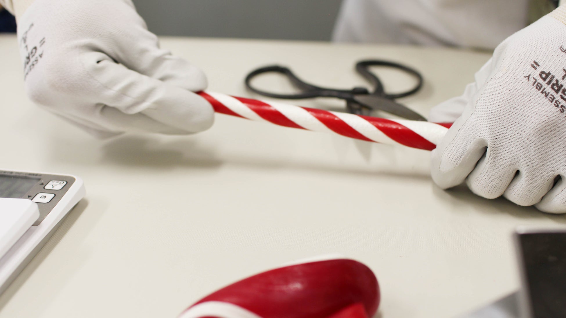 キャンディケーンの特徴である、杖状の湾曲部分を作るのは、何千本も製造してきた経験のなせる技です。