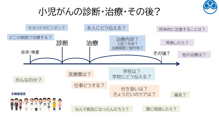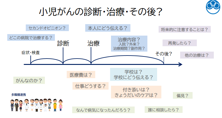 最後は、石丸紗恵先生が所属される国立がん研究センター中央病院のケースを参照しながらのお話でした。当該病院では、網膜芽細胞腫や骨軟部腫瘍、AYA世代(adolescent and young adult; 思春期と若年成人)の患者が多いという特徴があり、また治験への参加を目的にする再発・難治の患者の割合が高い傾向にあります。これらの患者は、住まいが遠方である場合も多く、経済的負担が大きかったり、家族と過ごす場を持てなかったりと、難しさを抱えやすくなります。また、AYA世代に関しては、自分の時間の確保が求められていることにも触れられました。