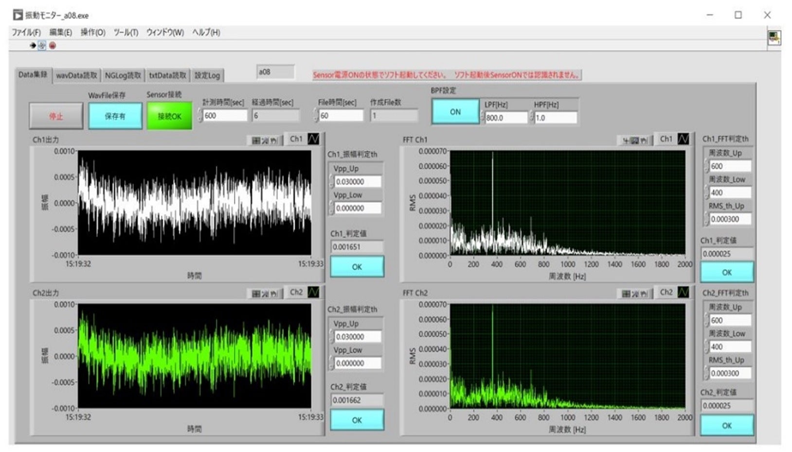 PC上にてリアルタイムでの信号波形計測(判定)と波形グラフの表示、FFT解析結果の表示、データ保存を行います。同時に2つのセンサーの計測データを2つのチャネル(ch)に同時に表示が可能です。