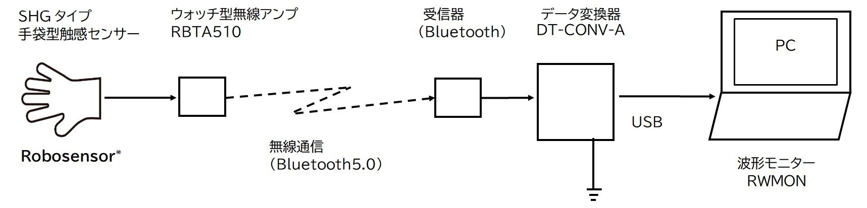 RH500シリーズを構成する基本製品は、人の手から触感データを取得する手袋型触感センサー (SHG100)と、ウォッチ型無線通信アンプ(RBTA510: Bluetooth5.0ワイヤレス通信デバイス)、および無線受信機とセットで動作するデータ変換器(DT-CONV-A)、さらにPCにインストールして動作する触感データ解析システムとなる波形モニター(RWMON)の4製品から構成されています。これら製品を全てまとめたものがRH500システムの評価用サンプルとなります。