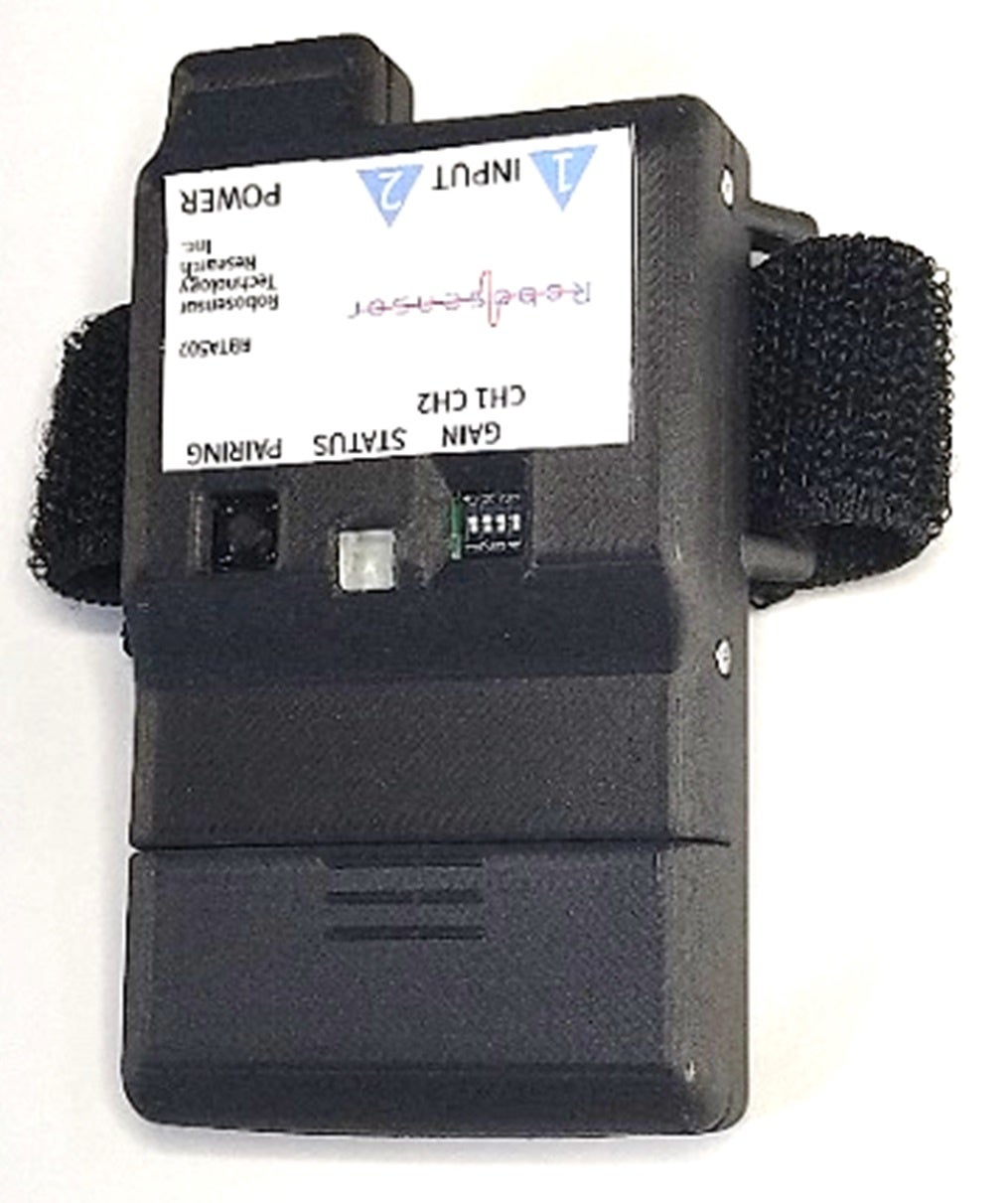 触感センサー手袋(SHG100)を手にはめて、ウォッチ型無線通信アンプ(RBTA510)を手首にバンドで装着します。触感センサーにて得られたセンサー信号は、無線通信(Bluetooth5.0)により半径10メートルの範囲で無線通信が可能となります。小型充電式の単4型バッテリー2本で、10時間以上の連続の無線データ通信が可能となるため、PCに送られたデータは切れ目の無い連続計測がリアルタイムで可能となります。