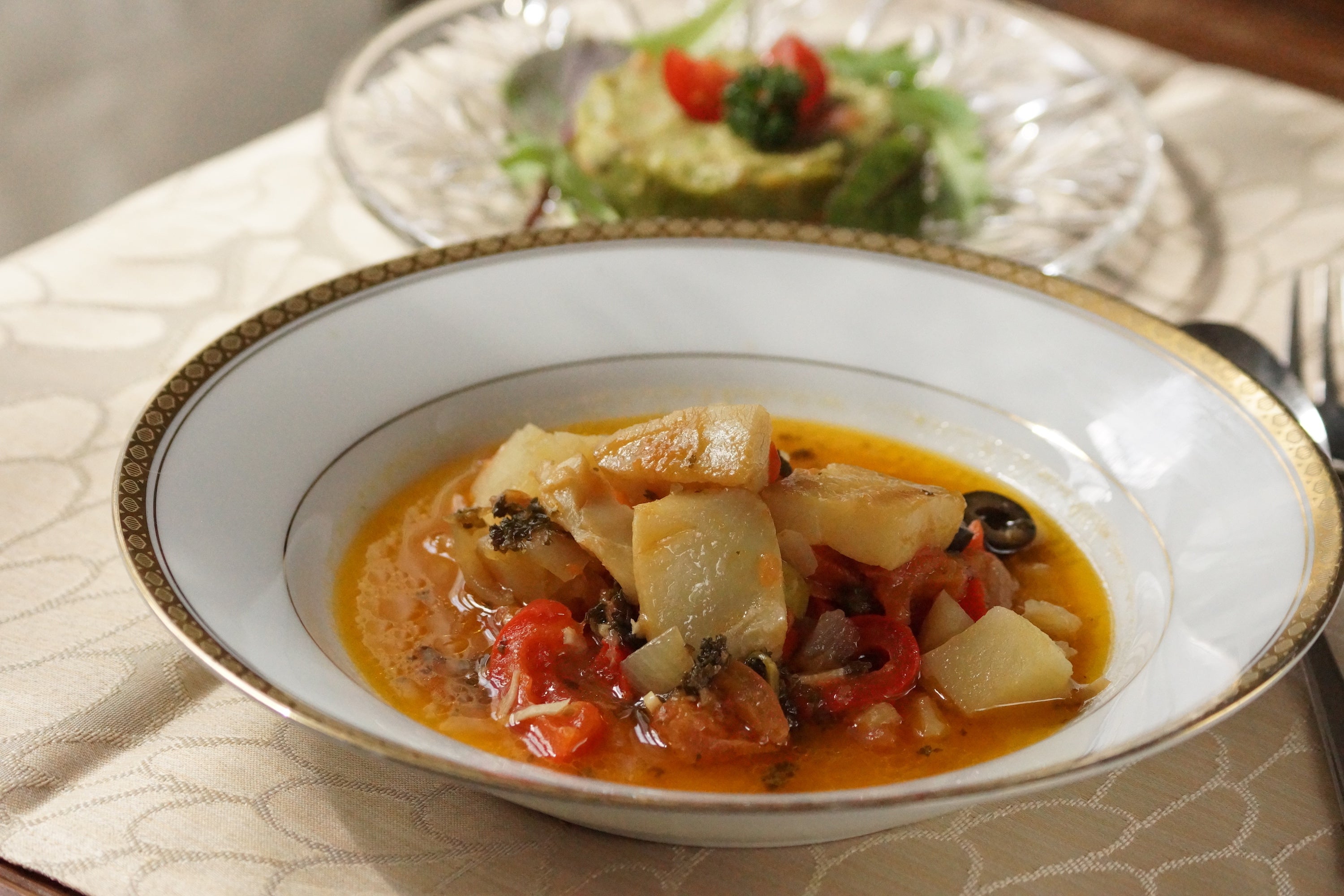 バカリャウ(塩漬けの鱈の干物を水で戻したもの)はポルトガル国民のソウル・フードです。大航海時代から長く国民に愛され、普段の食事にもお祝いにも欠かせない食材です。また、種類が豊富なソパ(スープ)もポルトガルではたいへんよく食されます。南ポルトガルでよく使われるコリアンダーもふんだんに入ったこのソパ・デ・バカリャウには、まさにポルトガルの味が詰まっていると言えます。日本のみなさんのお口にもきっと合うと思いますので、ぜひご賞味ください。