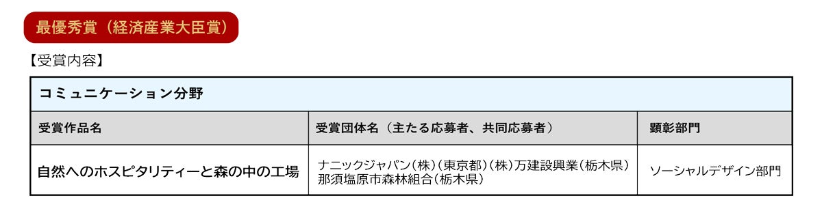 ナニックジャパン株式会社(本社:東京都渋谷区初台、代表取締役:甘露寺信房)は、ウッドデザイン賞2024において、当社の「森の中の工場」が、最優秀賞「経済産業大臣賞」を受賞しましたので、お知らせいたします。