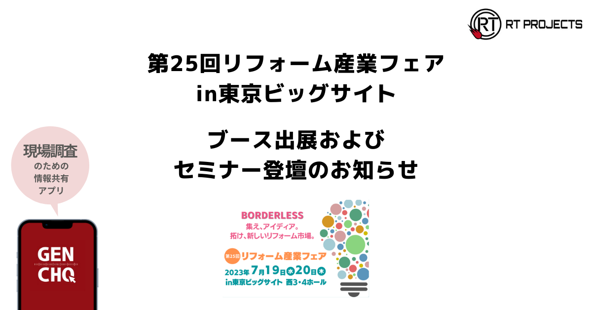 【7/19(水)・20(木)開催】リフォーム産業フェアに、現場調査のための情報記録・共有アプリ「GENCHO」が出展!トレンド・技術セミナーには代表の城山が登壇。