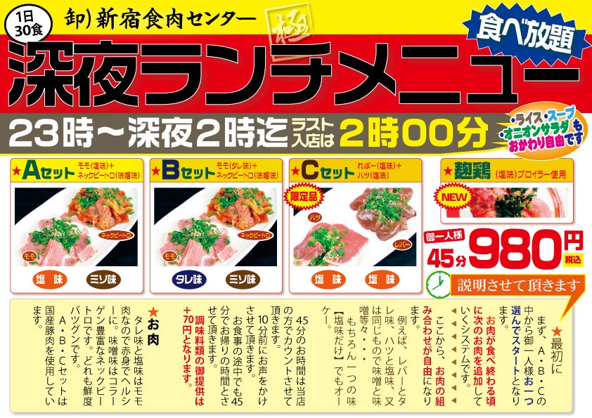 1日に2回(昼11:30~15:00夜22:00~25:00)、数量限定で行われる焼肉・ホルモン食べ放題は、45分間でお1人様980円(税込)と激安価格でご提供させて頂いております。内容も国産豚のもも肉・ネックピートロやハツ、さらに当店の看板メニューでもある「あみればー」に使用される当日ものの新鮮なればーも食べ放題です。また豚肉以外に鶏肉もあり、ライス・スープ・オニオンサラダもおかわり自由と非常にお得で満足感のある内容です。系列店の新宿食肉センター極 新宿本店でも同内容で「深夜ランチ」と称し真夜中の焼肉食べ放題が話題でしたが、コロナ禍による混雑緩和のため中止を余儀なくされておりました。