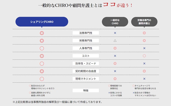 そこで、この度、「人事・労務・法務に精通」した専門家が、従来の顧問弁護士サービス以上に「より現場」に入り、経営者の片腕になることで事業の成長を加速させるべく、「シェアリングCHRO」というサービスをリリースさせていただきました。人事・労務・法務の横断的な現場マネジメントに課題のある企業様は、是非一度、「シェアリングCHRO」をご活用ください。