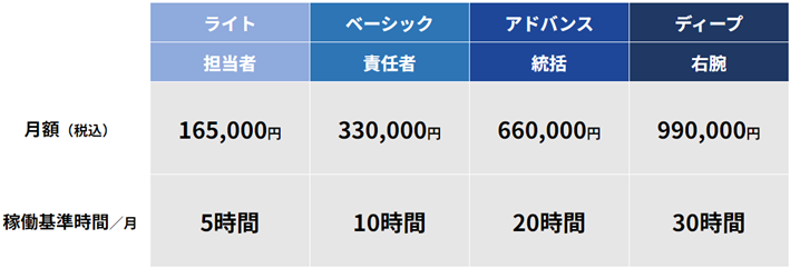 上記稼働基準時間を超過した場合、別途超過時間に相応する時間報酬(タイムチャージ)を頂きます。尚、担当者によって時間単価が異なります。