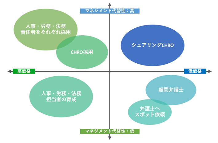 顧問弁護士の雇用は比較的安価ですが、基本的に現場に入ってのサポートは少ないケースが多いです。一方で、一般的にCHROを雇うには約1,500万円の年間人件費とそれに応じた採用コストがかかります。シェアリングCHROであれば膨大なコストをかけずに即戦力人材を獲得できます。