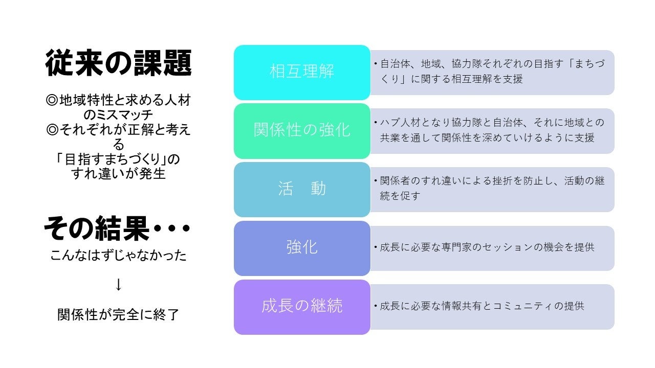 弊所がハブ人材となり協力隊と自治体、それに地域との共業を通して関係性を深めていけるように支援する方法です。