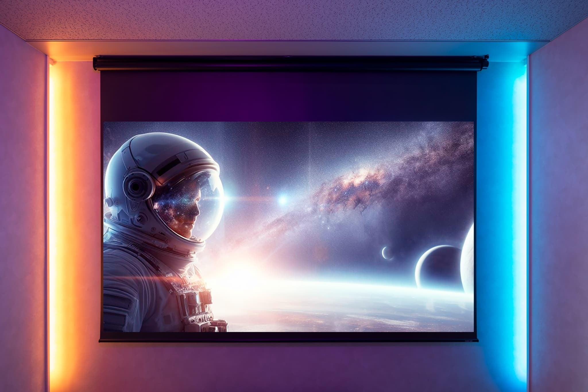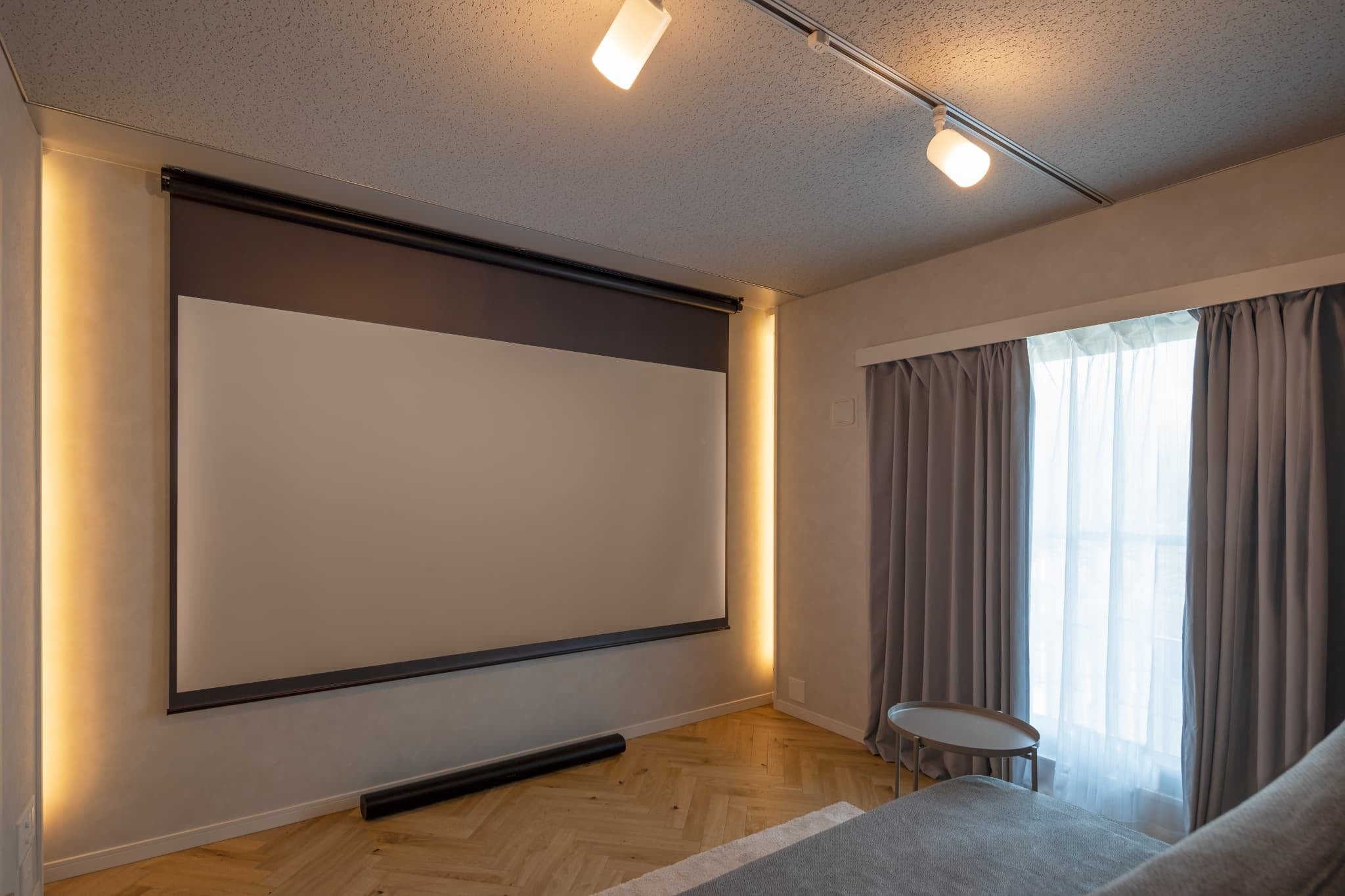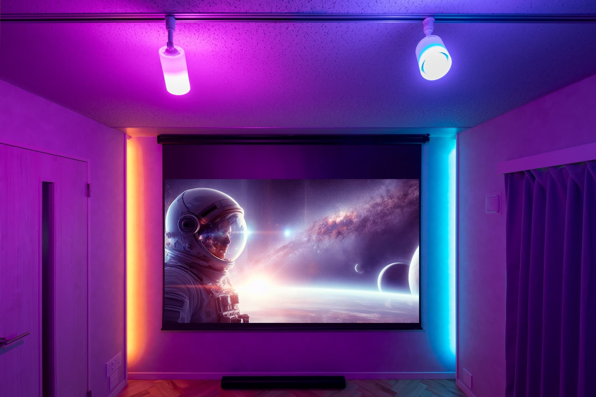 スクリーン設置壁面の間接照明と、天井スポットライト(ライトの数を増設可能)をスマートフォンで操作可能。映画鑑賞には暗く落ち着いた照明、スポーツ観戦には明るく活気ある照明といったように、光の色と明るさを自在にコントロールし、シーンや視聴するコンテンツに合わせた空間演出が実現します。