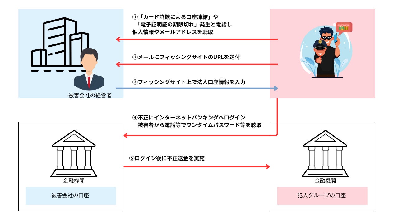その後、不正にインターネットバンキングにログインし、電話等で取引実行パスワードやワンタイムパスワードを聞き出し、不正送金を実施