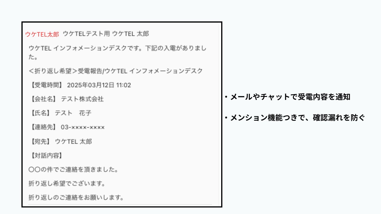 ウケTELとは、代表電話を代わりに受付け、要件をチャットやメールで送るサービスです。