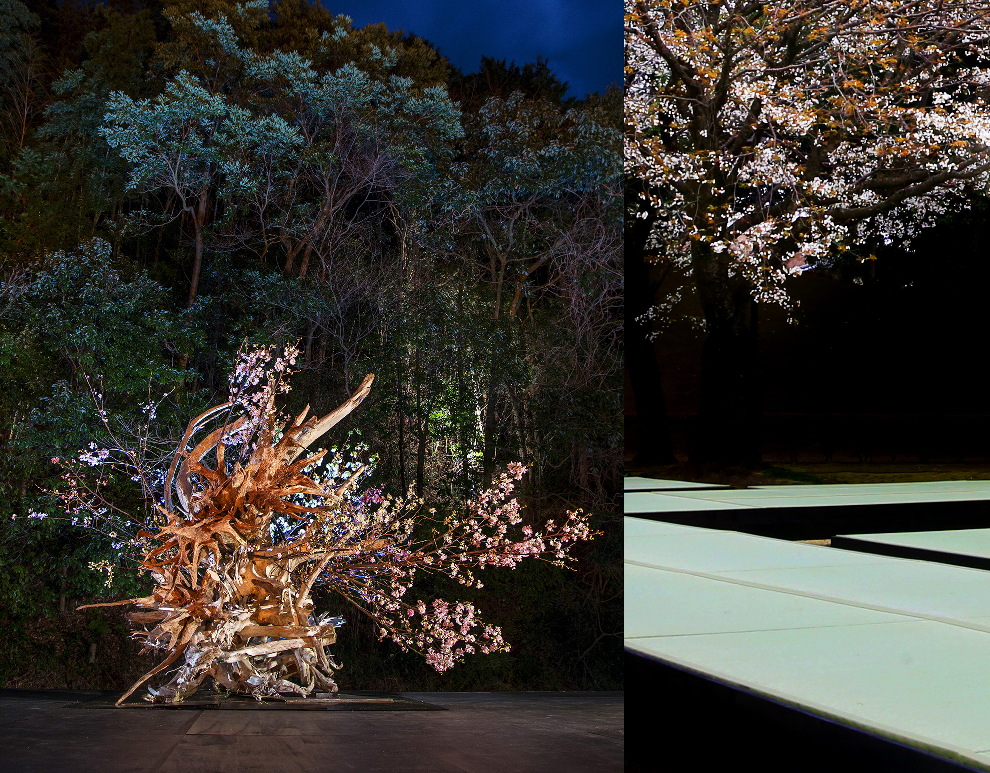 桜の樹のもとで春のお料理を愉しむことのできる特別な「花見席」を、当料亭芸術顧問 華道家 辻雄貴が空間演出。 日本人にとって縁の深い桜を用いたインスタレーションと、浮月楼庭園の染井吉野を眺めることのできる特別な室礼をつくりだします。