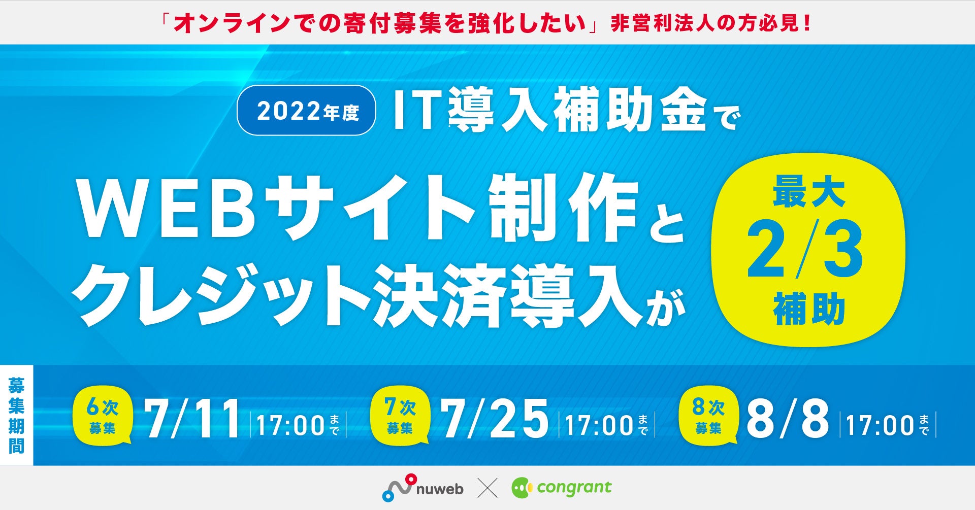 これにより、非営利組織のWEBサイト制作費用とクレジット決済システムコングラント2年分のご利用料金の最大2/3が補助されます。