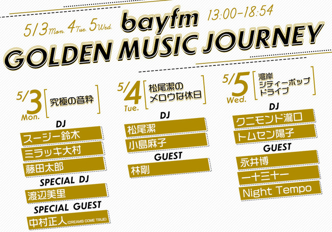 5月3日(月・祝)~5日(水・祝)13:00~『bayfm GOLDEN MUSIC JOURNEY -音楽”尽くし”でアナタに”尽くす”3days-』