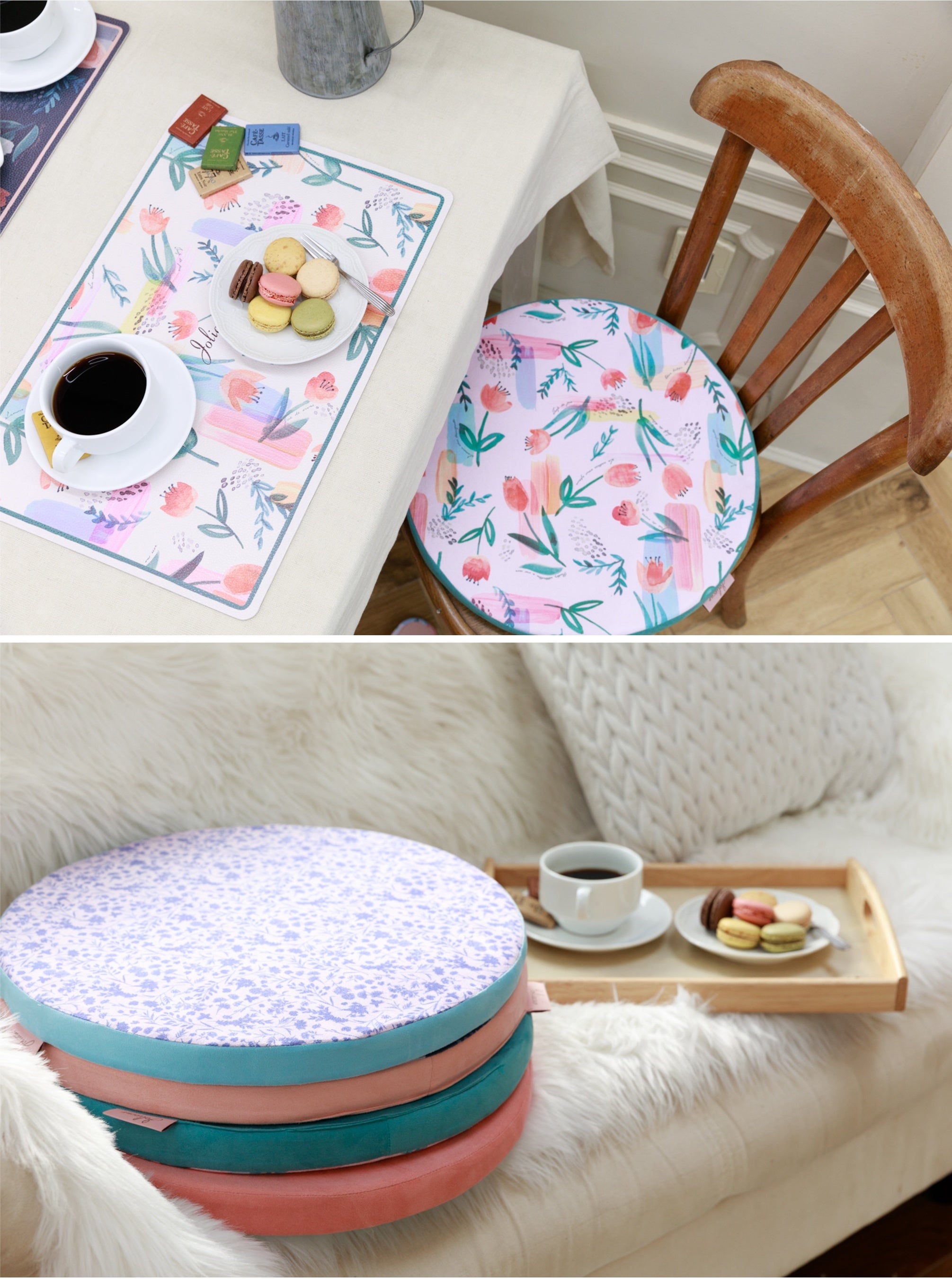 ・アイテム:水彩花柄ラウンドクッション、小花柄ラウンドクッション
