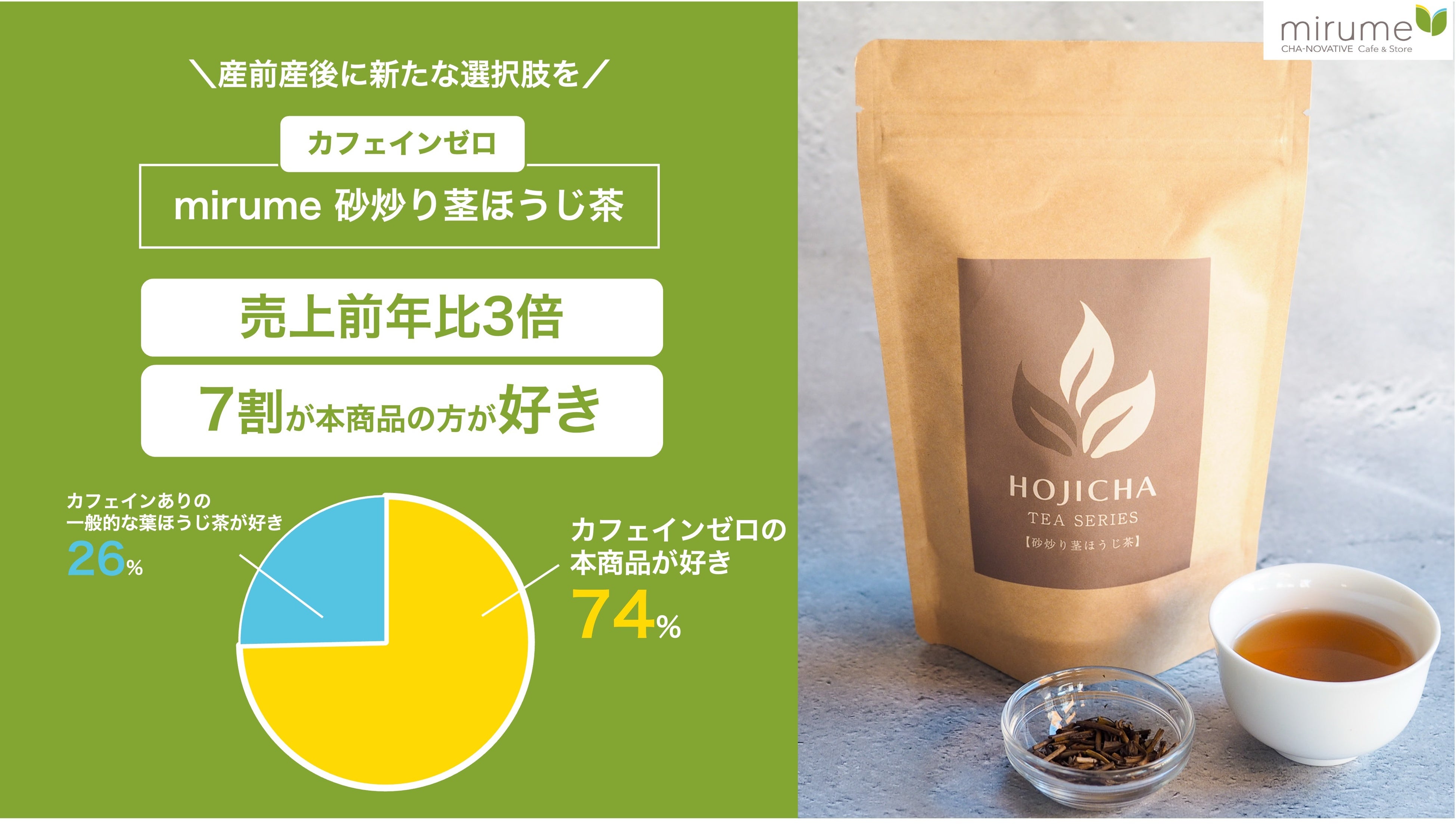 ”お茶”で産前産後ケアに新たな選択肢を。逆転の発想で誕生し、高級料亭でも採用!カフェインゼロの『mirume 砂炒り茎ほうじ茶』製造困難と思われた、おいしさとカフェインゼロを両立し、売上前年比3倍達成