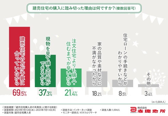 「建売住宅の購入に踏み切った理由は何ですか?(複数回答可)」と質問したところ、『建売住宅の方が予算に合っていたから(69.5%)』と回答した方が最も多く、次いで『現物を見て購入判断ができるから(37.3%)』『注文住宅よりも購入・住むまでが早いから(21.4%)』『家の品質や素材などに不満がなかったから(18.2%)』『住宅ローンの手続きなどがわかりやすいから(8.5%)』と続きました。