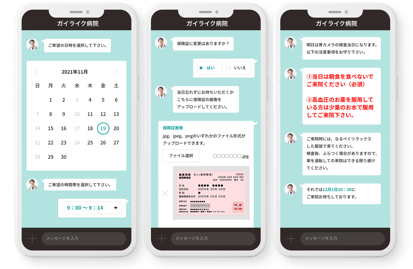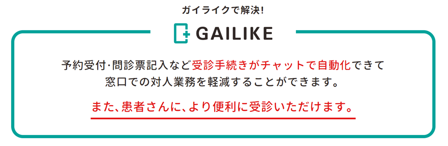 また「ガイライク」最⼤の特徴は、ITの苦⼿な⾼齢患者でも利⽤可能なUI/UXにしている点です。⾼齢患者には、 弊社専任のテレフォンオペレーターがチャット上の操作を代⾏する仕組みを実装しています。