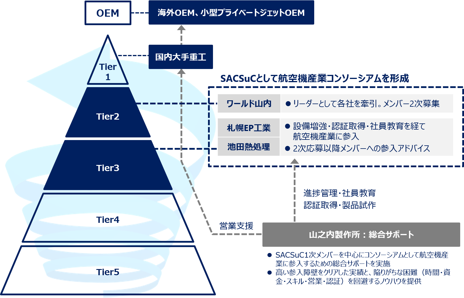 2022年3月30日、株式会社ワールド山内(北広島市)を代表とし、株式会社池田熱処理工業(札幌市)、札幌エレクトロプレイティング工業株式会社(札幌市)の3社は、航空機産業向けサプライチェーン「Sapporo Air Craft Suppliers Club」(以下、SACSuC:サクサク)が本格的に始動するため、発足式を行いました。