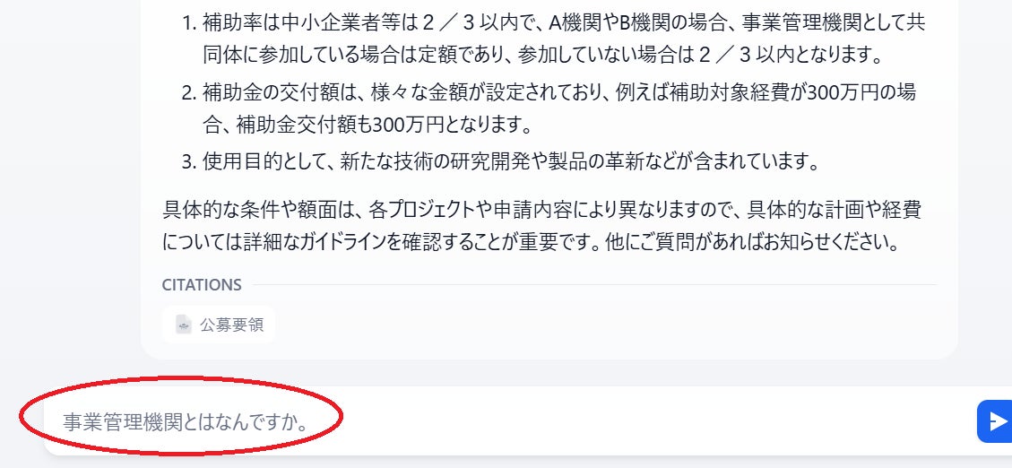 従来は補助金の詳細を理解するためには、100ページ近い公募要領を読み込む必要がありました。「補助金なんでも相談AI」では、質問形式で補助金の内容を確認することが可能になります。また「ホームページ制作費用も補助されますか?」といった公募要領に直接記載がない具体的な質問に対しても大規模言語モデルの特性を活かして回答できるようになっています。無料で公開しておりますので、是非とも補助金業務にご活用頂けると幸いです。