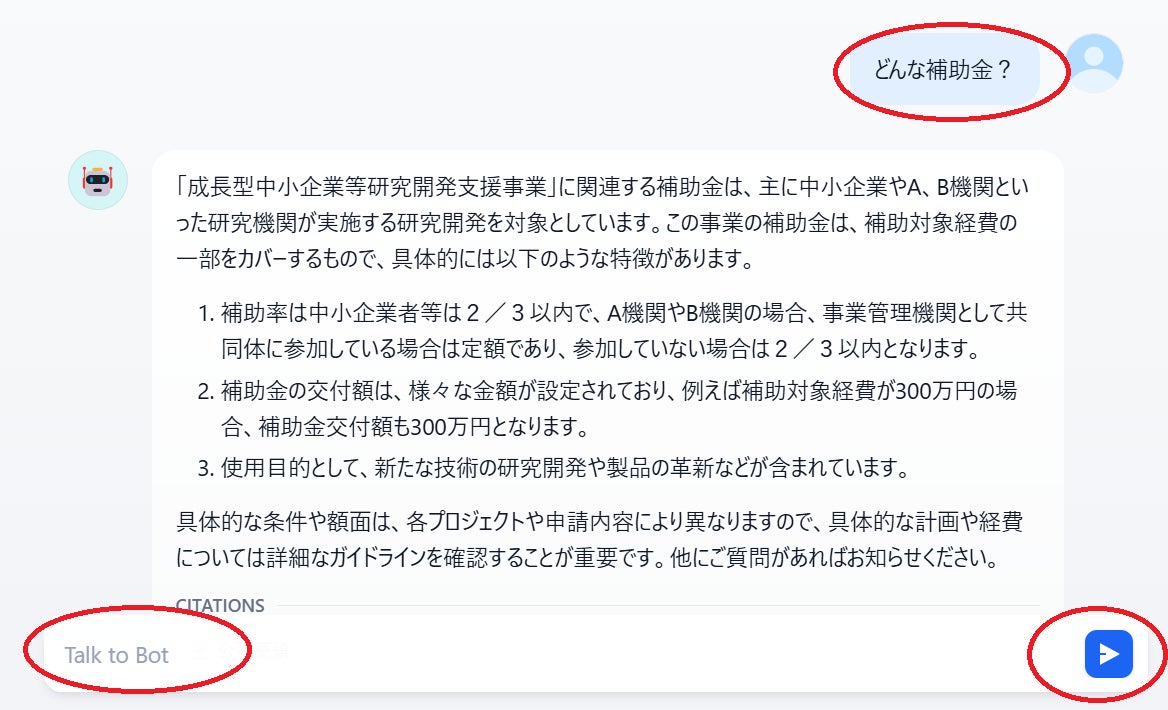 下段のTalk to Botに質問を入力して右の青いボタンをクリックして送信します。回答が生成されます。