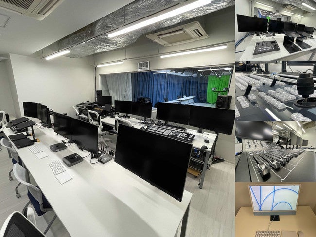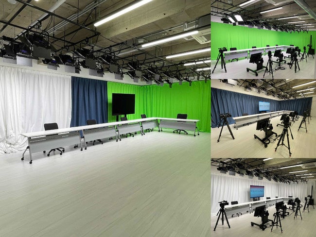 スタジオエリアはソーシャルディスタンスを保ちつつ5〜6名撮影可能、背景は白壁・全長17mのカーテン3色(白・紺・緑)の4種、床面を含め全身クロマキー合成が可能、カメラ・照明・マイクはイベントに合わせて追加可能となっており、取り扱い可能映像は48ソース、音声は56ch、LED照明x34灯です。