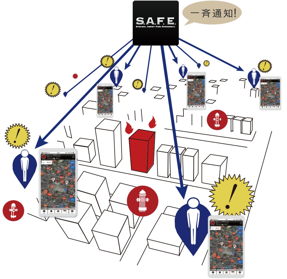 当社が取り扱う「消防団支援アプリS.A.F.E.(セーフ)」は、消防団員が、火災情報や団員・車両の状況を瞬時に把握でき、迅速かつ最適な行動を実現するスマートフォン・タブレットのアプリケーションサービスです。