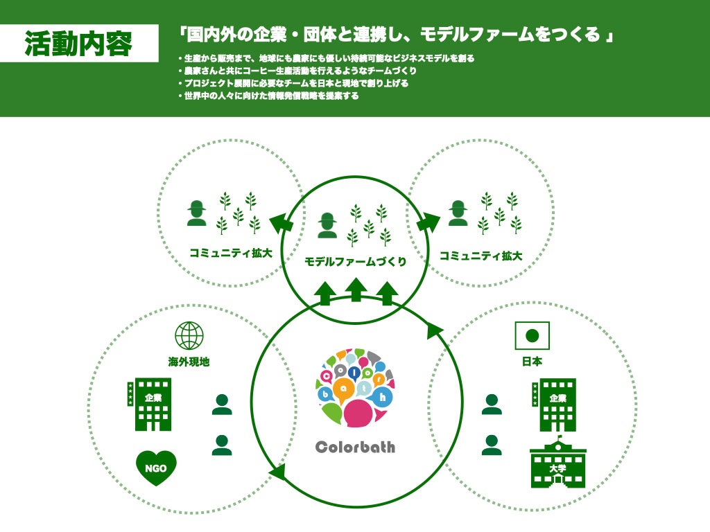Colorbathでは、コーヒーの品質向上に向けた技術指導だけではなく、マーケティングや販売、消費者とのつながりにも及ぶトータルサポートを、現地NGOやコーヒー会社、日本の専門家と連携することで実現してきました。