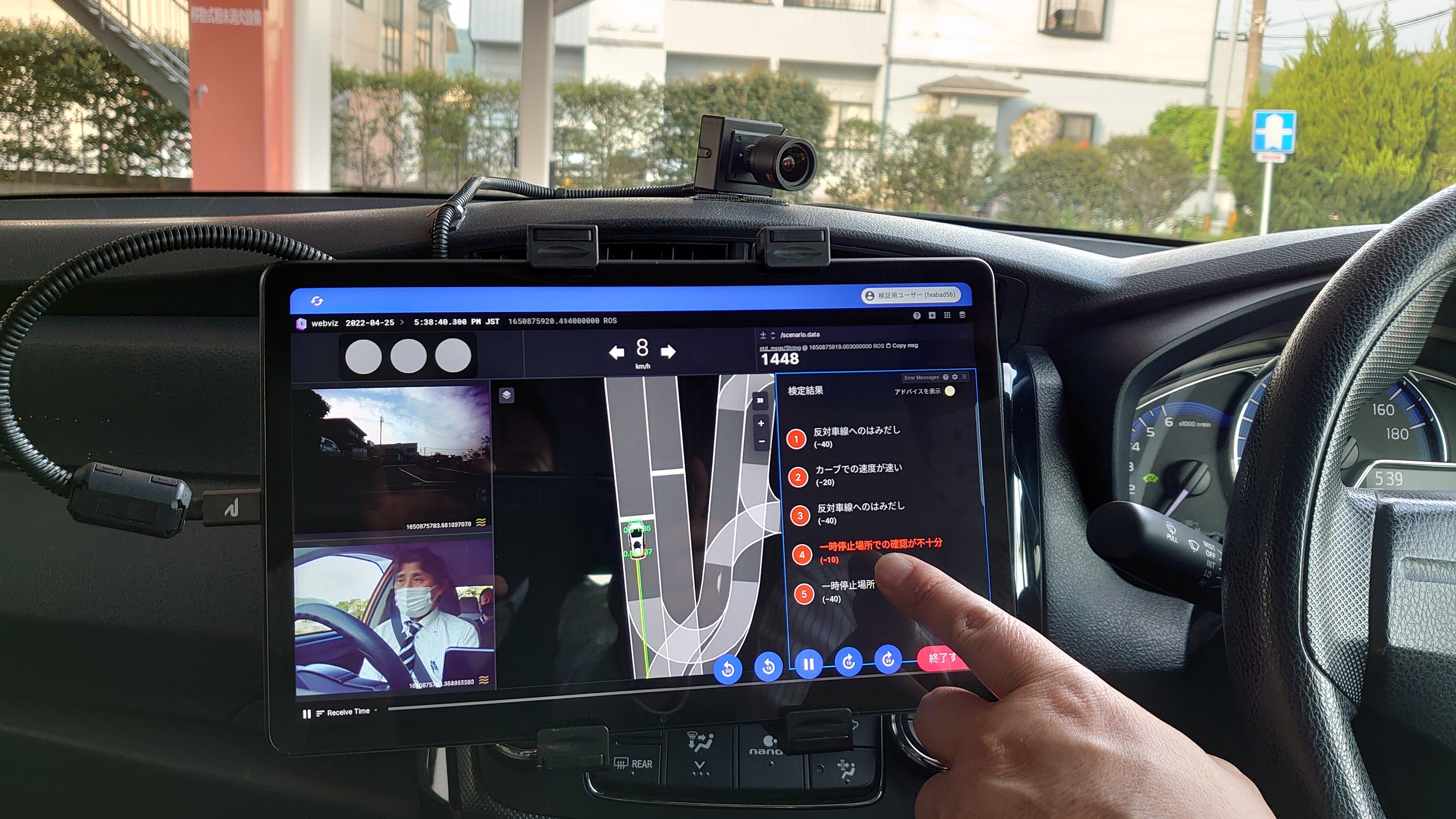 また、運転席のタブレットで受講者自身が講習メニューを選択し、走行後は自身の運転を映像で振り返ることにより、運転技能の向上を図ります。指導員の同乗なしでも安全に受講ができるよう、一定の条件で作動する自動補助ブレーキが実装されています。