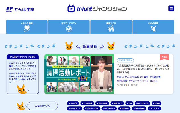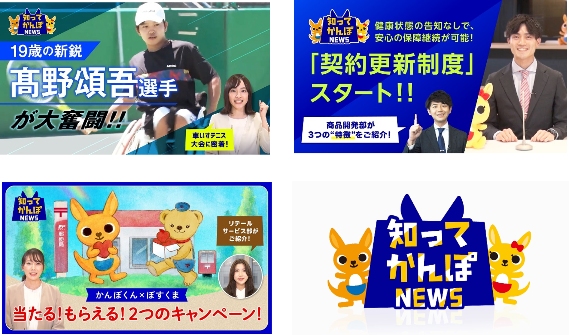 オウンドメディアサイト「かんぽジャンクション」では、上記動画の他、かんぽ生命の取り組みを紹介する「知ってかんぽNEWS」を順次公開中です。かんぽ生命が実施する最新のキャンペーンや新商品の情報、協賛するパラスポーツの取り組みやSDGsの活動などを社員自身が取材して発信しています。