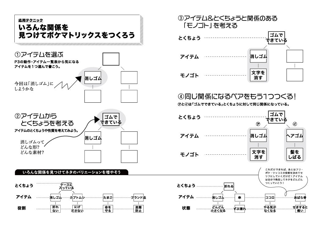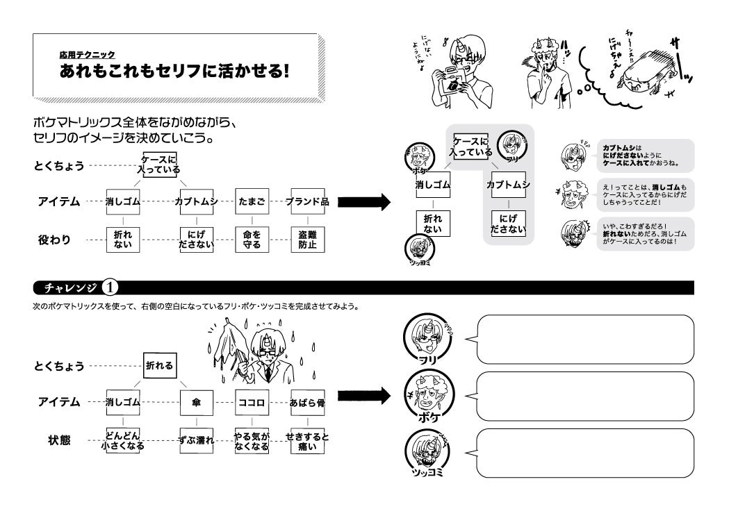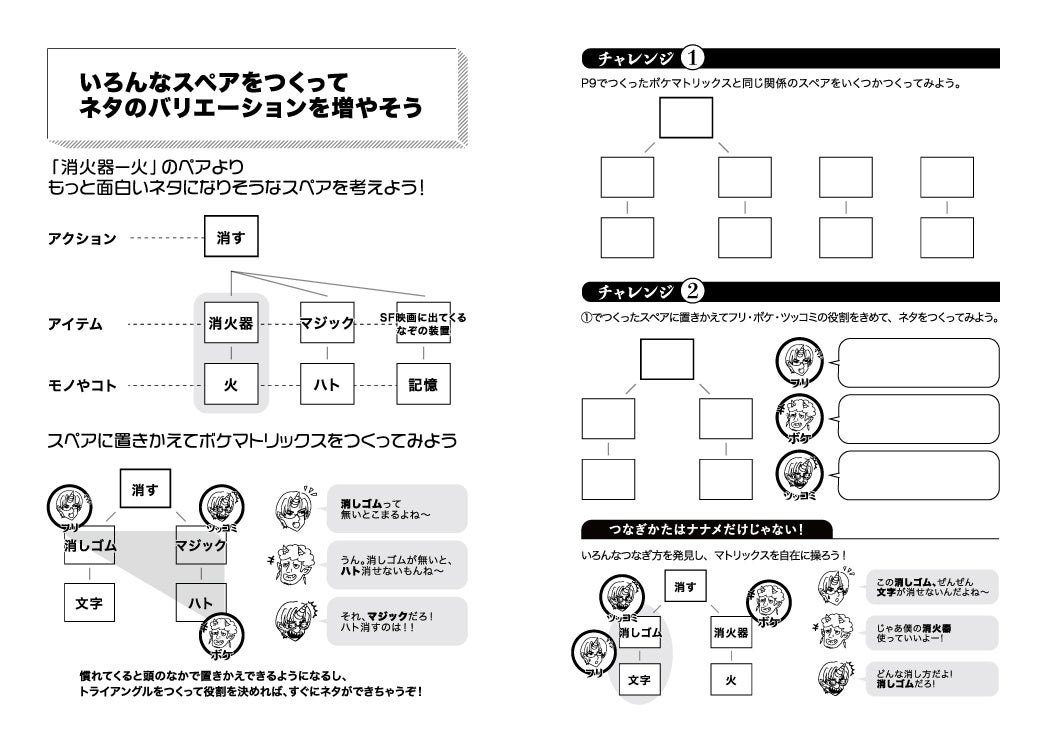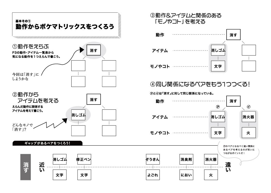 モノゴトの関係性に気づき、それをズラすことでボケが生まれます。視覚的にわかりやすい図解で、モノゴトの関係性を学びながら自分でボケやツッコミが作れるようになる、これまでになかった画期的な学習ドリルです。