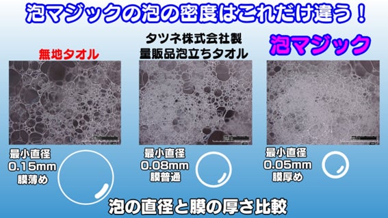 国産浴用ボディタオルのトップメーカー、タツネ株式会社さんと共同開発した“泡マジック”は市販の石鹸でもホイップ状の超濃密泡を作り出し、肌の汚れをきれいサッパリ洗い流す男性用高機能ボディタオルです。