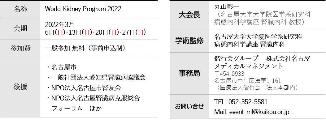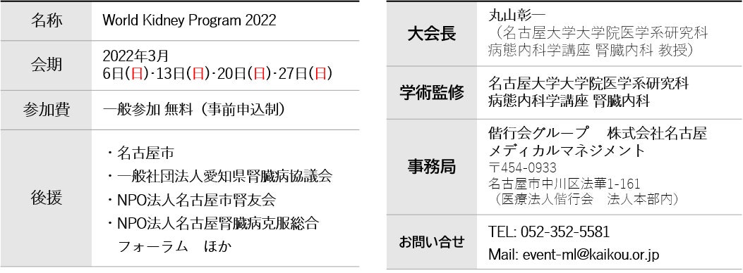 毎年3月第2木曜日の「世界腎臓デー*³」に合わせ、一般市民に向けて腎臓病に関する基礎知識から透析治療の最新情報まで、3月毎週日曜日4日間にわたり、30以上の演題を無料オンライン配信します。