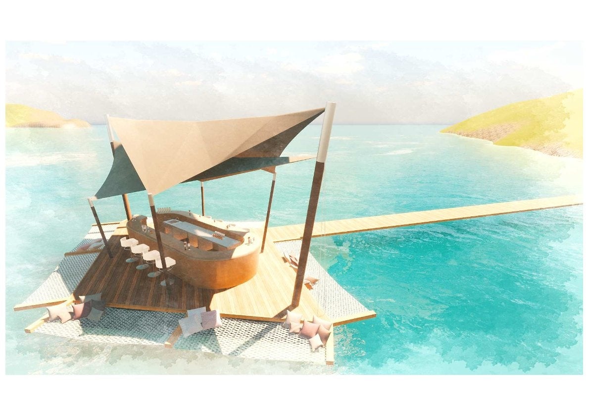 「ON THE SEA」はアイランドビーチから延びる桟橋を歩いて渡り、そのまま入店できるフローティングバー。バーテンダーを囲むように設計されたオーバル型のカウンターには、ゆったりとしたカウンターチェアを8席、フローティングバージ(注1)には、海にせり出すハンモックを4方向に設置しました。ハンモックに身をゆだねれば、まるで海に浮かんでいるかのような気分に浸れ、波の音や潮の香り、波しぶきをダイレクトに感じることができます。
