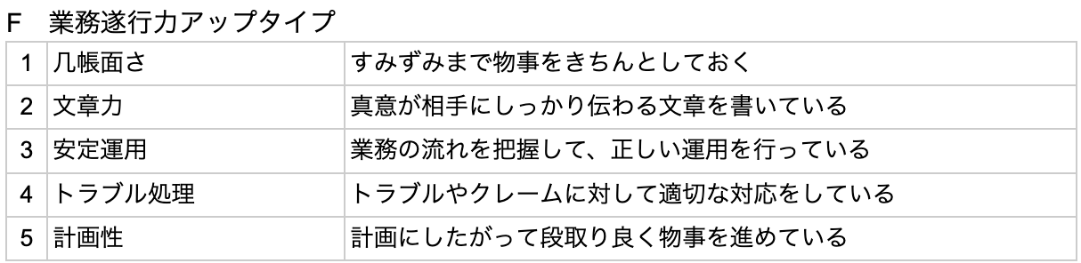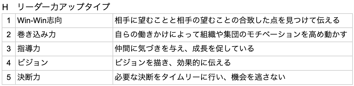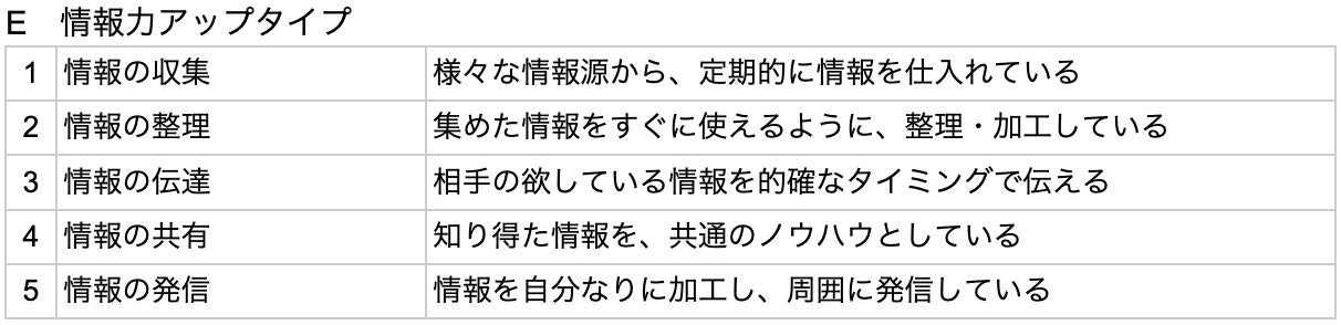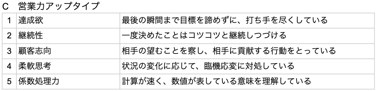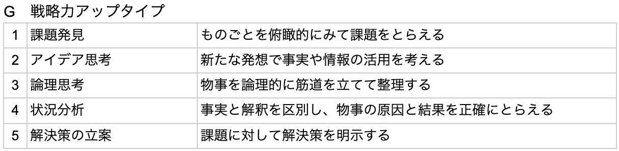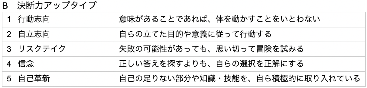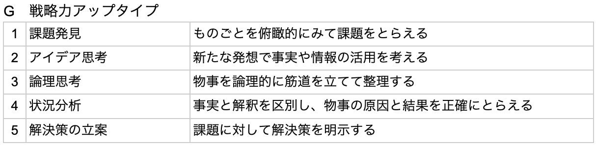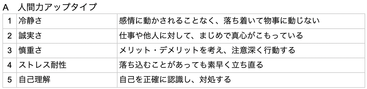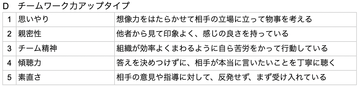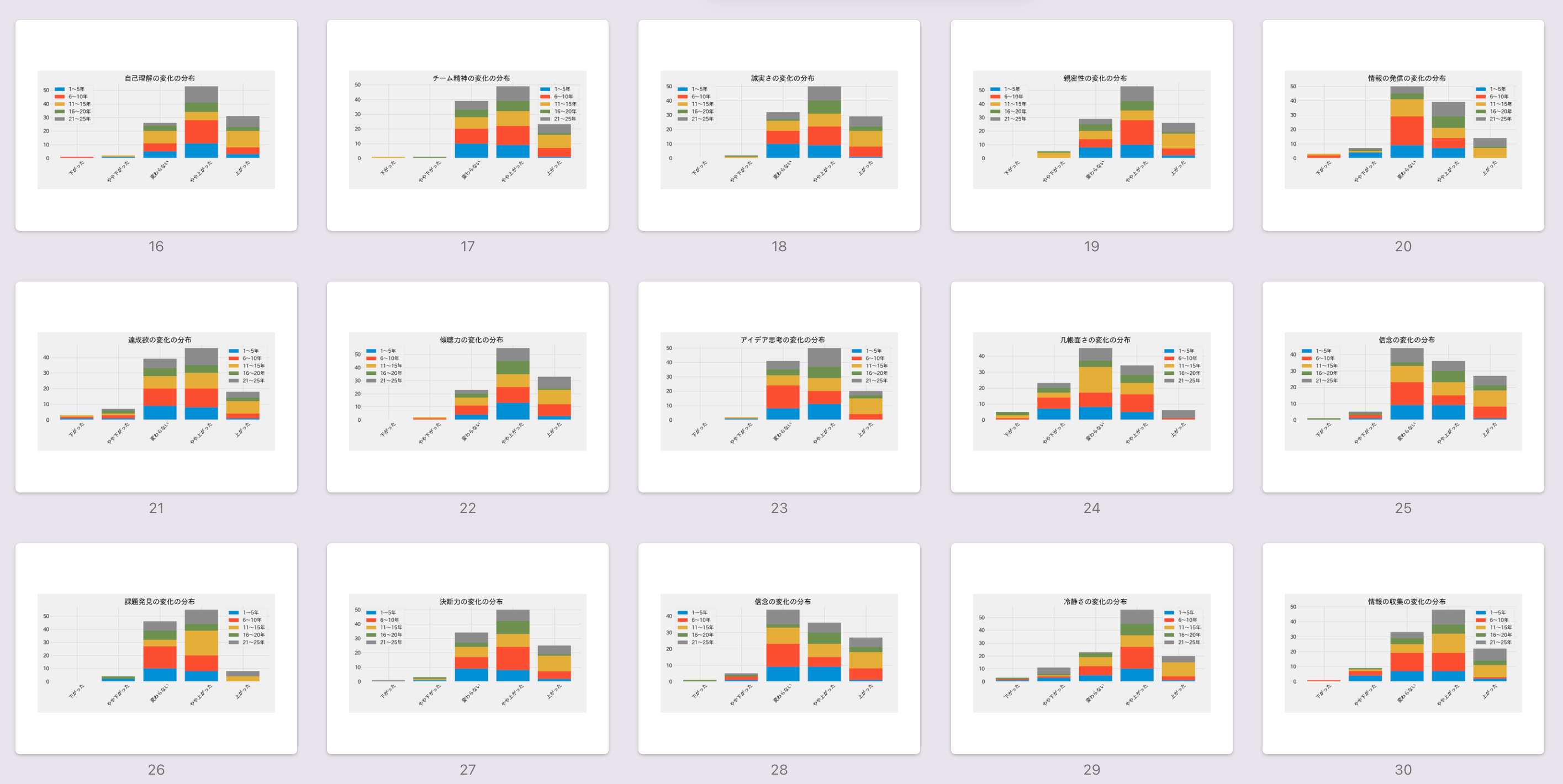 鍛えられた能力の一覧はとしてはコンピテンシーモデルを参考に作成し、40項目を選び、5段階評価(2点:上がった、1点:やや上がった、0点:変わらない、-1点:やや下がった、-2点:下がった)で自己評価採点してもらい、集計を行いました。