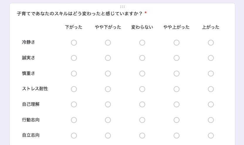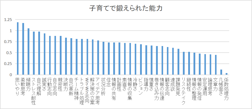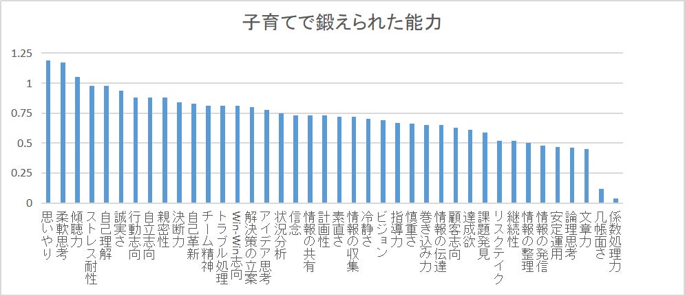 子育て中は、子どもと向き合い続ける中で、思い通りにならないことに対峙する機会が非常に多いため、他人を思いやる能力が伸びたり、予定通りいかない臨機応変さやが求められるからこそ柔軟思考が伸びたりするという、とても納得感がある結果となりました。