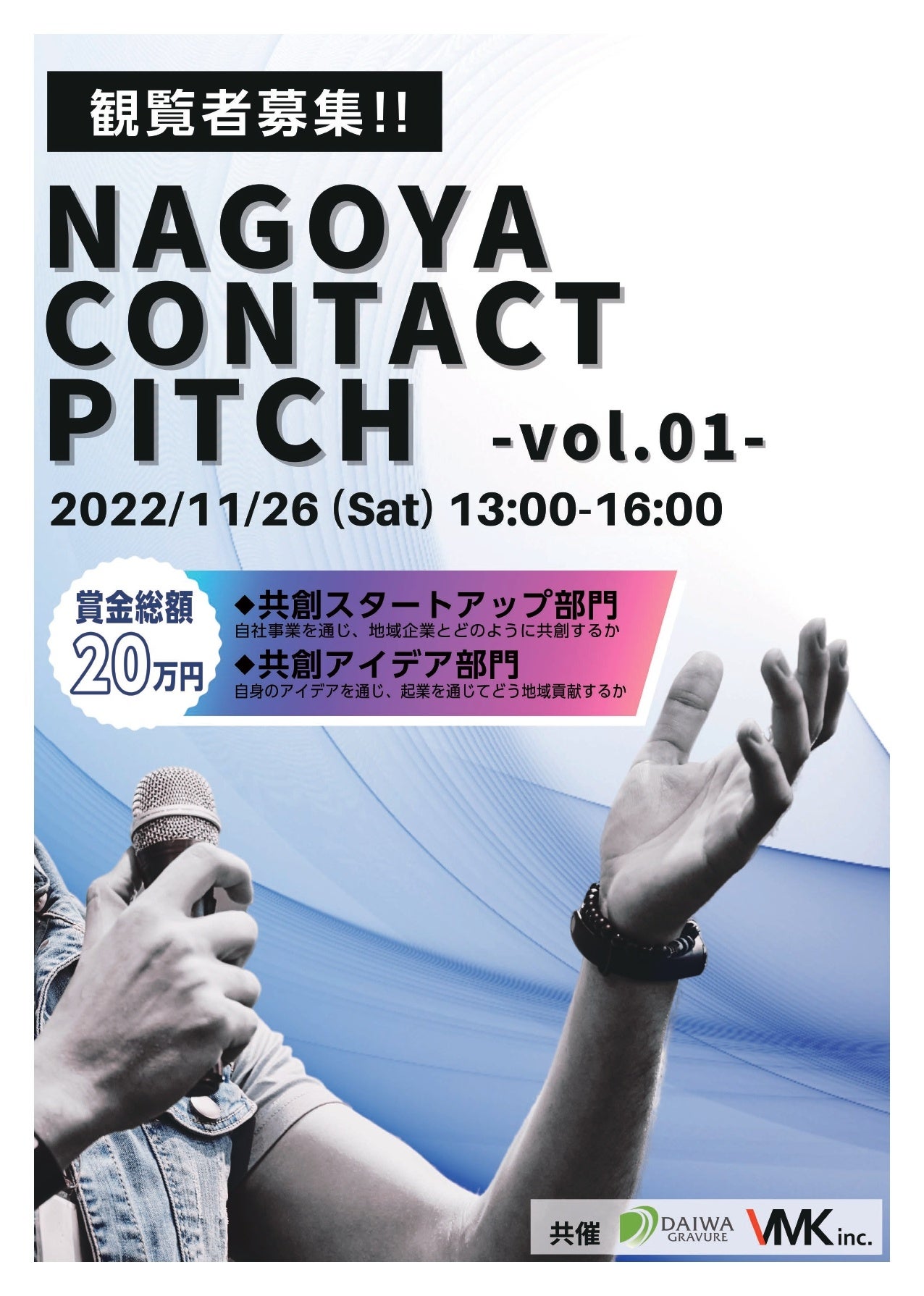 そこで、大和グラビヤ本社と同じフロアでコワーキングスペース事業を展開する株式会社VMKとコラボレーションし、愛知を拠点とする若手起業家や学生が将来活躍するためのきっかけをつくるため、ピッチコンテスト”NAGOYA CONTACT PITCH”を共催することにしました。