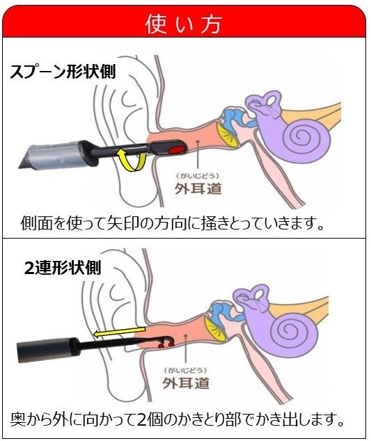 「極上しなやか耳かき」はどちらのタイプの耳垢でも2種類の新型ヘッドと適度にしなる材質で安全にしっかりと掻きだすことができます。
