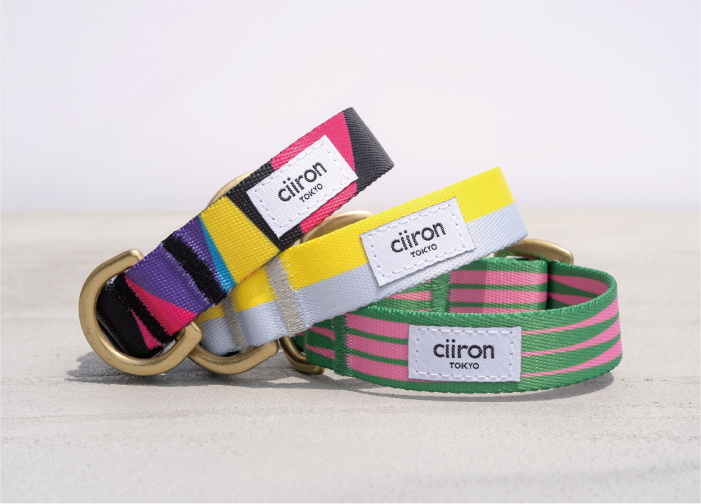 ciiron TOKYO のアイテムは、1つ1つオリジナルのデザインで作られており、ファッションからインスパイアされた、シンプル且つ美しいパターンやカラーの掛け合わせによって生まれる思いがけな いサプライズを大切にしています。ジェンダレスで、どんな相棒(犬) の毛色にも合うデザインバリエーションも魅力の1つです。また、品質を重視し、縫製は全て国内の職人が1つ1つ丁寧に仕上 げています。テープの両端を糸で包み込むような縫製技術を採用しており、犬の首周りもチクチクせず、つけ心地の良さにもとことんこだわっています。