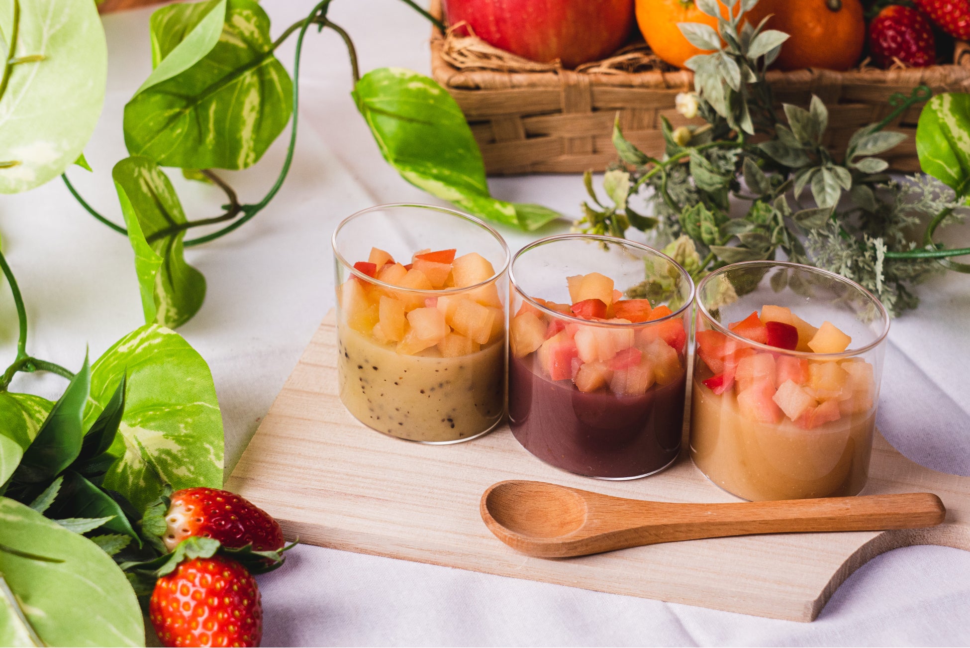 いちご、キウイ、りんごの3つのフレーバーをご用意。これらのフレーバーはシーズンに合わせて変化していきます。羊羹の上には季節毎に厳選されたフルーツを用いたコンポートがのり、これまでにない食感と味わいを体験することができる。