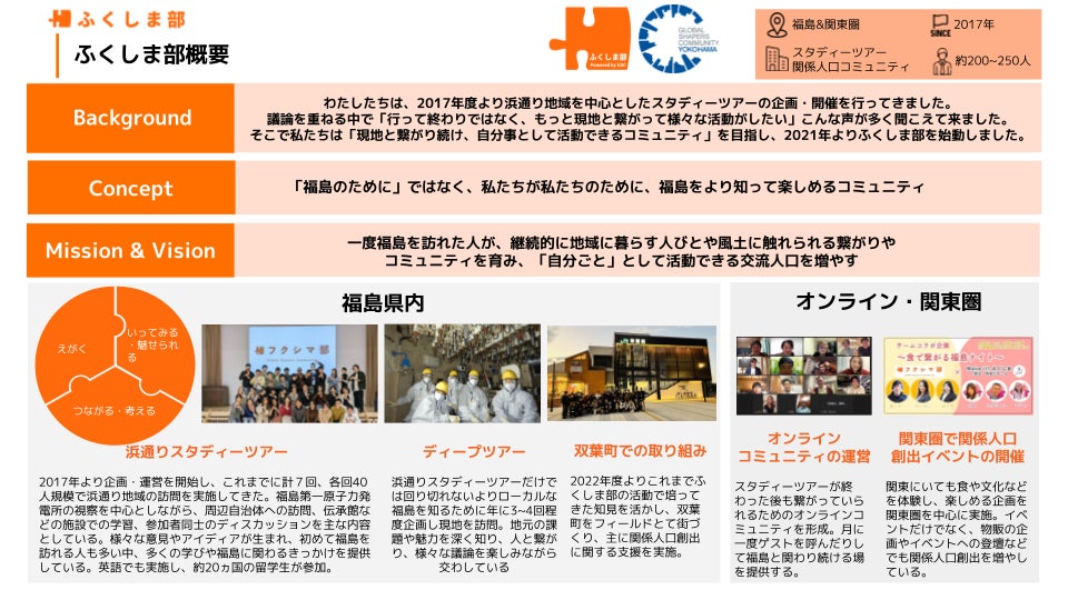 世界経済フォーラム(ダボス会議)の組織であるGlobal Shapers Communityの有志メンバーによって運営されてきた「ふくしま部」は、これまでの活動の成果を背景に新たなる展望に向け、2017年より実施してきたスタディーツアープログラムを更に多くの人々に届け、関係人口創出事業をより強化していくことを狙いとして、2024年3月11日に「一般社団法人ふくしま部」(所在地:福島県双葉郡大熊町、代表理事:牧野佑亮)を設立したことをお知らせいたします。