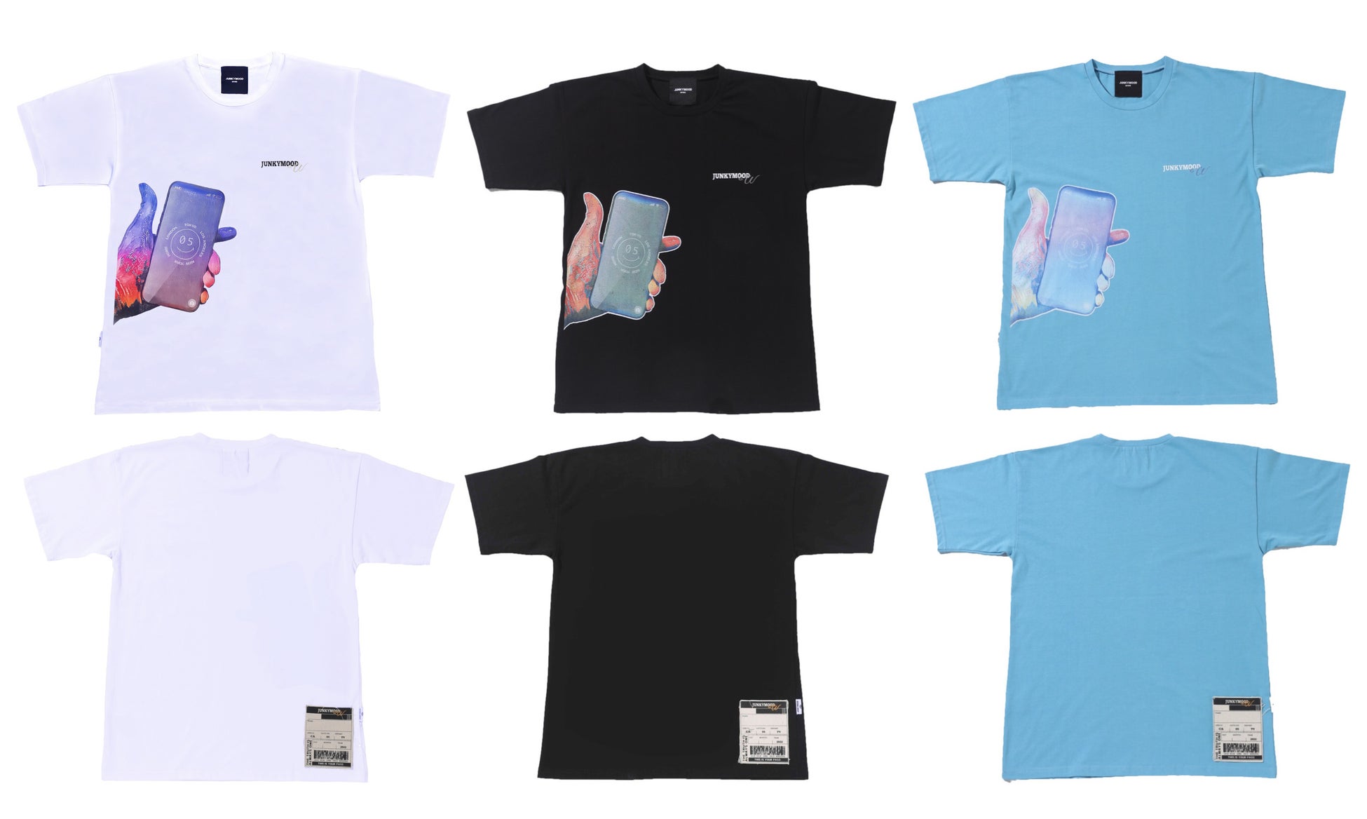 TシャツカラーはBLACK、WHITEの定番色の他に、JUNKYMOODのテーマカラーであるBLUEを加え3色展開となっております。